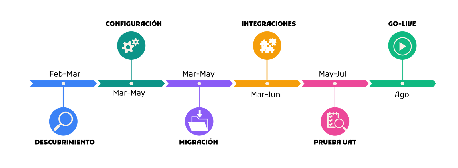 Las etapas de Migración e Integraciones se ejecutan en paralelo con Configuración. La Gestión del Cambio es transversal a todo el proyecto.